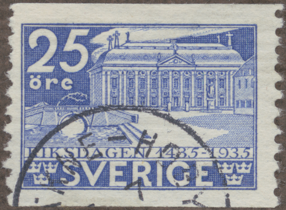 Frimärke från Sverige, 1935. Motiv av Riddarhuset i Stockholm "Den svenska Riksdagen 500 år: 1435-1935"