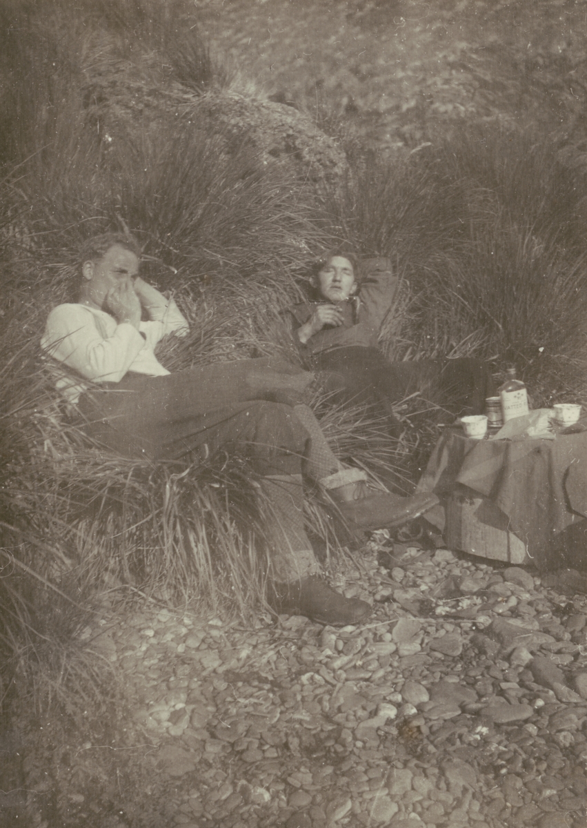 Bild från expedition i Antarktisområdet. Motiv av två män, Georg Ödegaard och Sten Holm Kjelesmed, som vilar bland buskar.