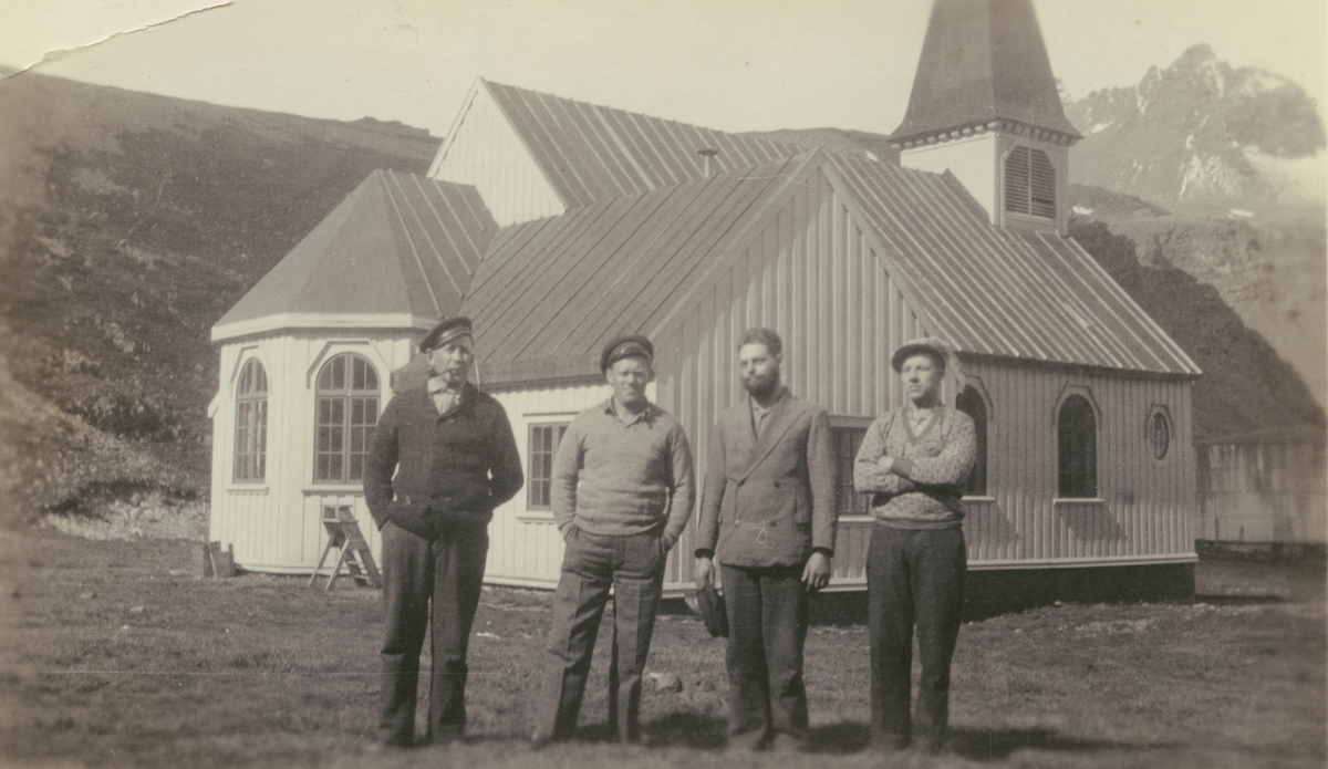 Bild från expedition i Antarktisområdet. Motiv av fyra män framför kyrka, 1930.
