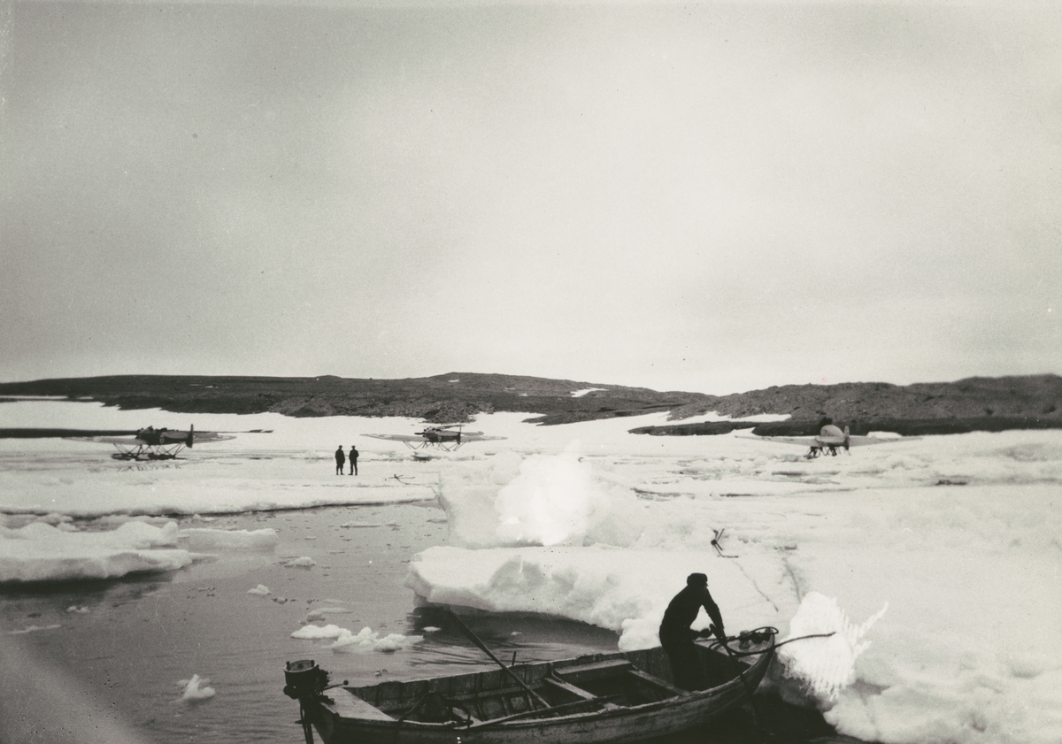 Fotografi från svenska undsättningsexpeditionen 1928. Motiv av flygbåtar och båt i ett islandskap i Murchison Bay.