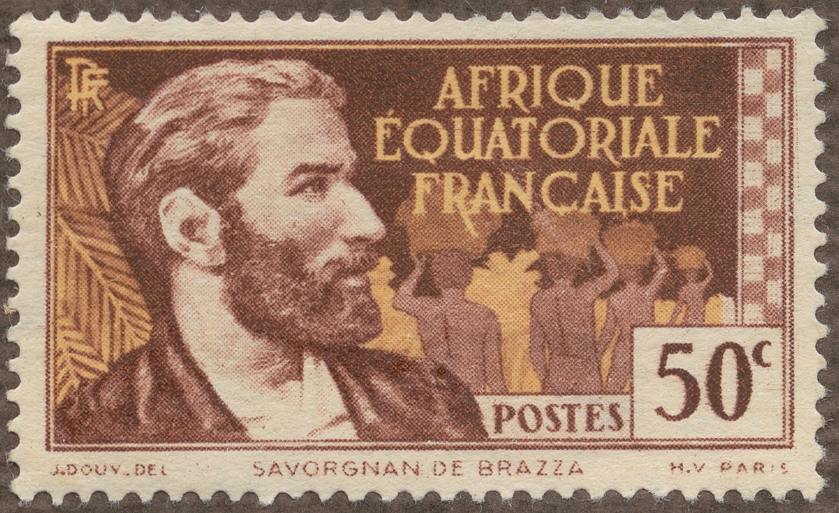 Frimärke från Franska Ekvatorial Afrika, 1937. Motiv av Pierre Savorgnan de Brazza: 1852-1905. Fransk upptäcktsresande och kolonigrundare. Förvärvade 1880 land för Frankrike nord om Kongo.