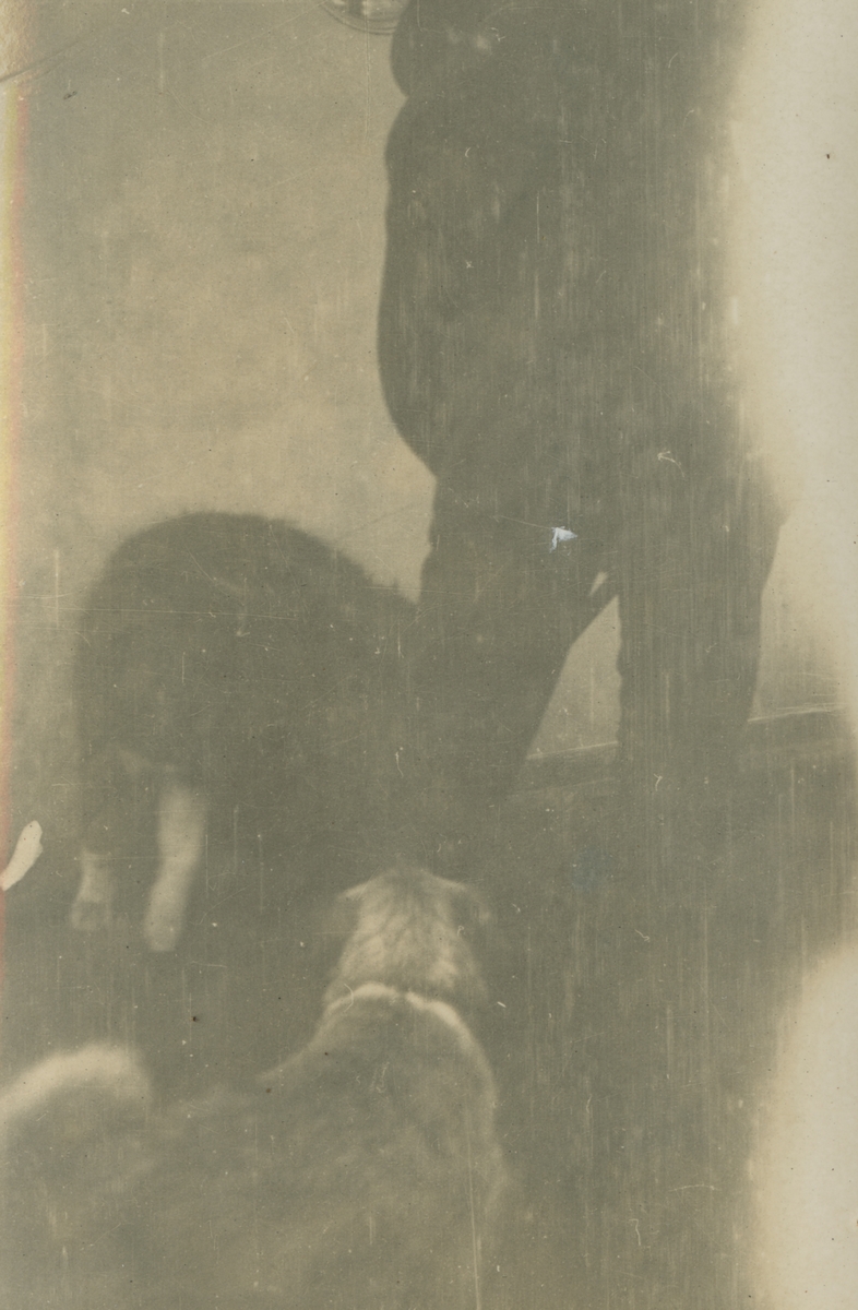 Fotografi från expedition till Spetsbergen. Motiv av man och två hundar, troligen ombord på en båt.