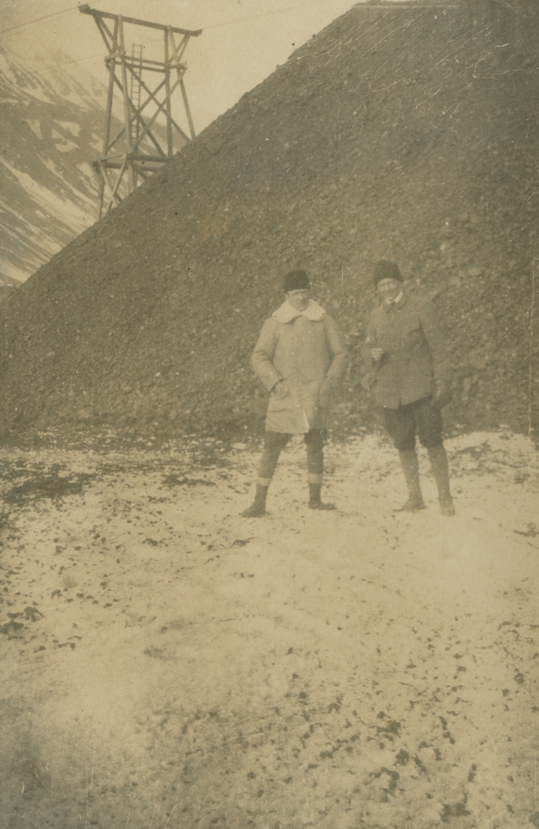 Fotografi från expedition till Spetsbergen. Motiv av två män som poserar bredvid ett berg av grus, troligen vid Sveagruvan.