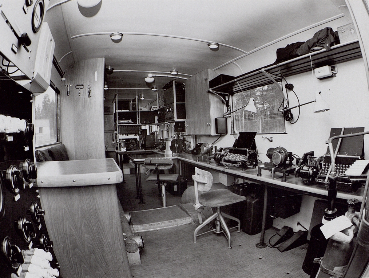 Stockholm. Mobil telegrafbuss avsedd att användas vid krigstillstånd. Interiör.