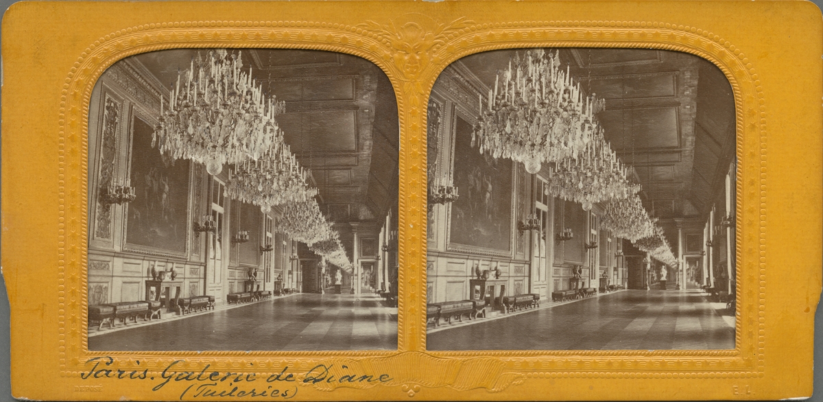 Stereobild med motiv från slottet Le Palais de Tuileries, Paris. Galleri de Diane. Palatset förstördes i en brand 1871.