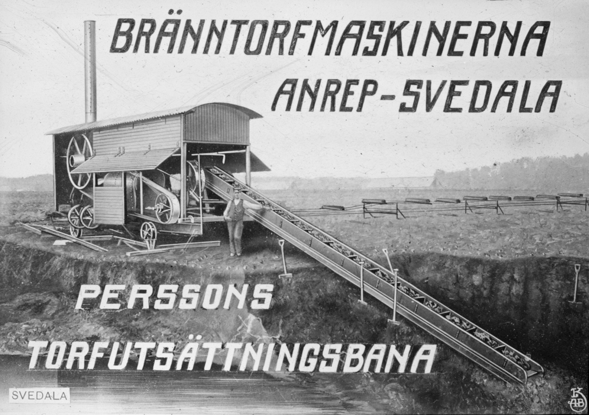 Skioptikonbild med motiv av bränntorvmaskin, Anrep-Svedala. Perssons torfutsättningsbana.