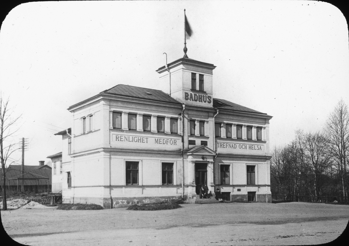 Skioptikonbild med motiv från yrkesinspektionens undersökningar på olika arbetsplatser. Okänt badhus.