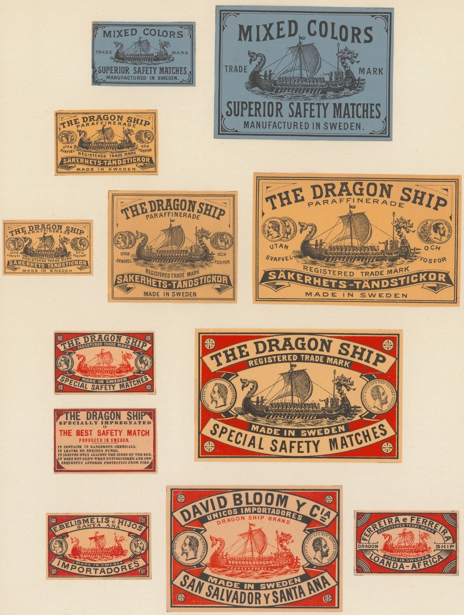 Etiketter för tändsticksaskar, från Svenskt Industri- och Handelsmuseum.