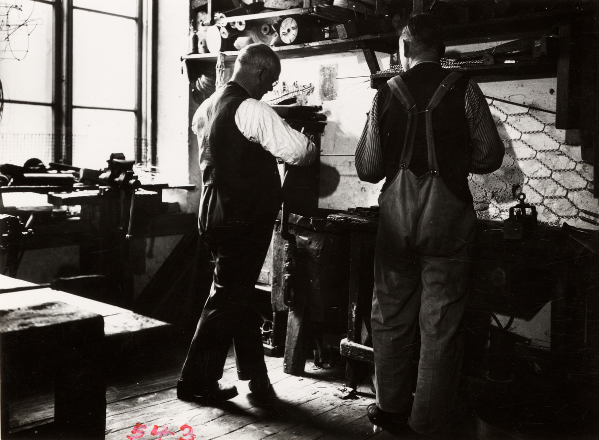 Knappnålstillverkning vid J.H. Tidbeck Metallduksväveri och Metalltrådsvarufabrik. Avskärning av tråd i bestämda längder med knäsax.