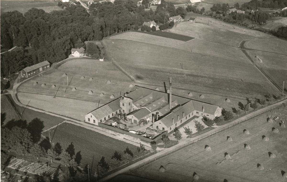 Flygfotografi över Hjo Mekaniska Verkstad HMV Strömsdalsvägen 22 Hjo från nordväst 1933.