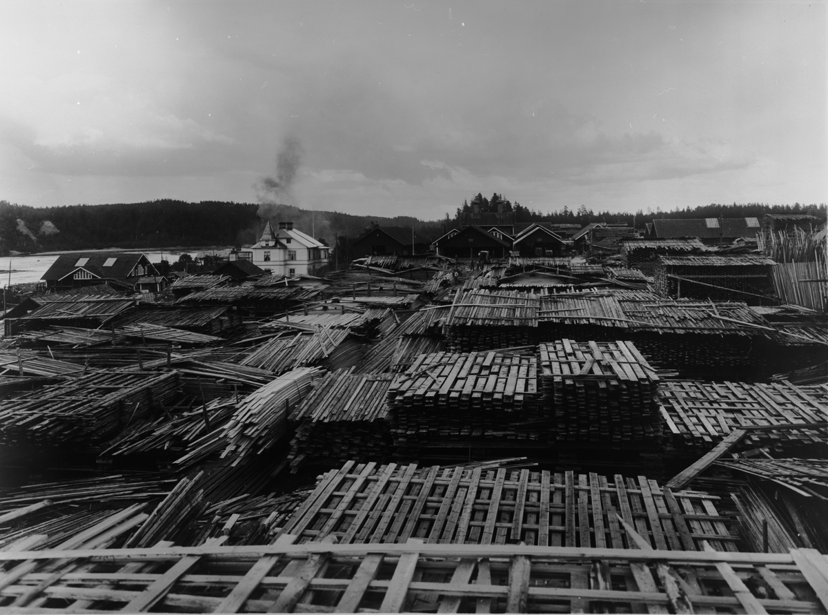 Brädgården, Avesta sågverk. Till vänster sågen, därefter förvaltarebostaden. Till höger om denna lastningsskjulen.