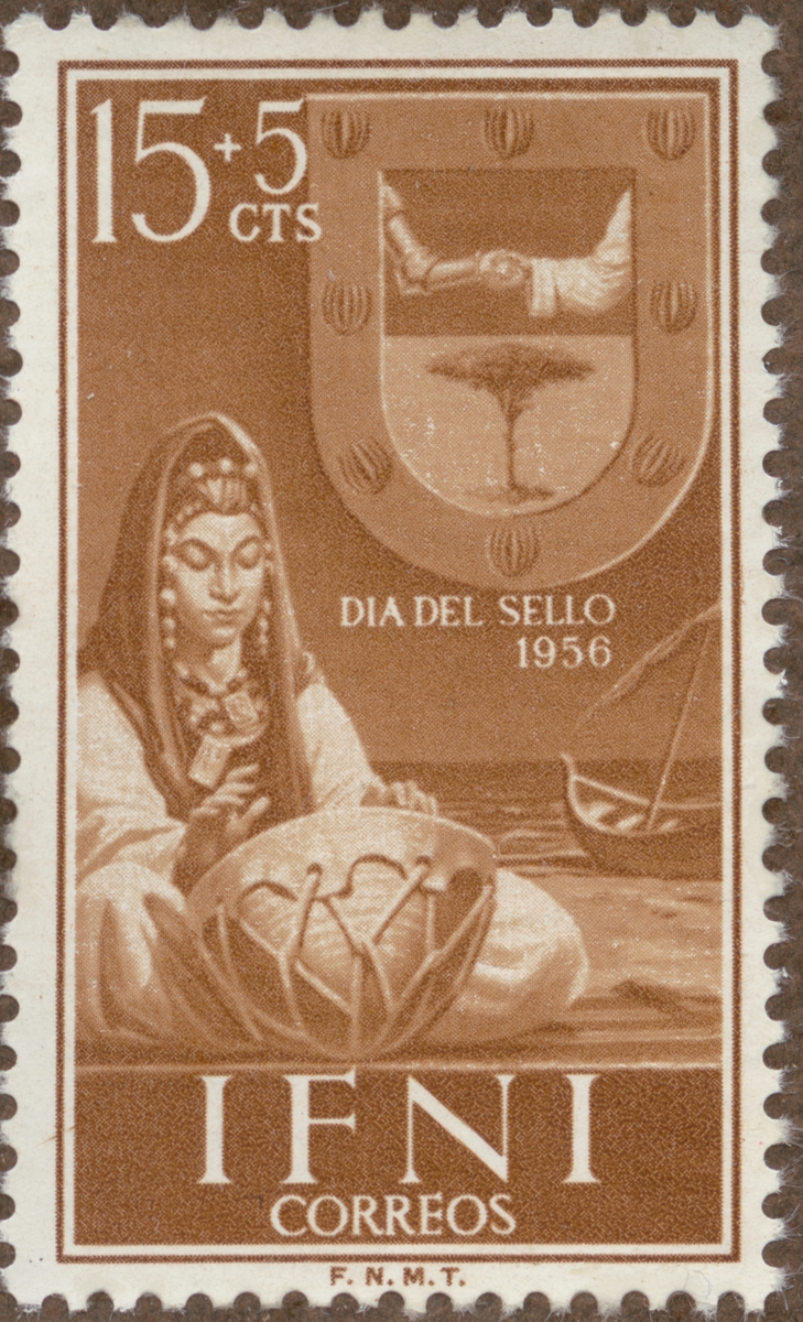 Frimärke från Ifni (Spanska Marocko), 1956. Motiv av Marockansk kvinna med tamburin. "Frimärkets dag 1956".