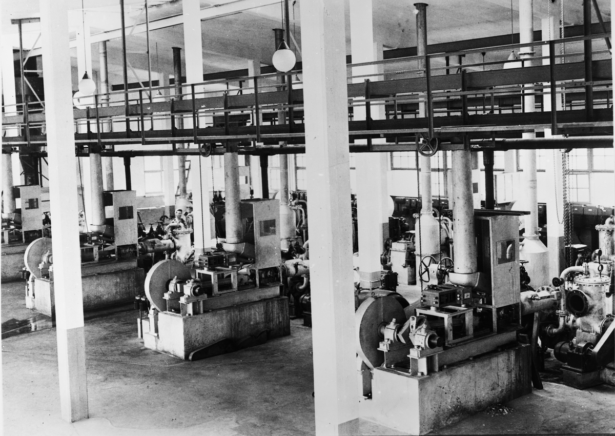 Stora fabrikssalen för malning av trämassa.