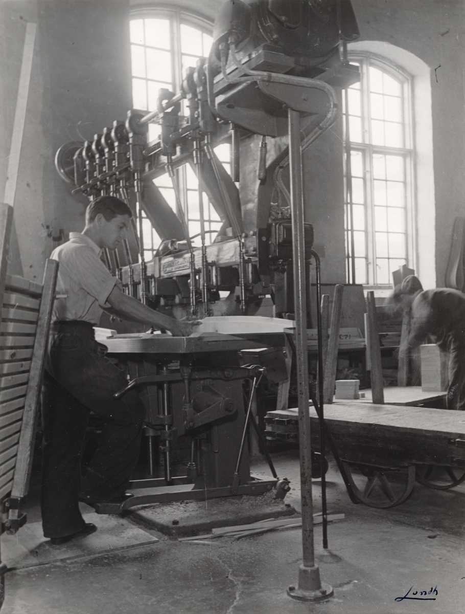 Vid möbeltillverkningen användes store specialbyggda borrar av denna typ.