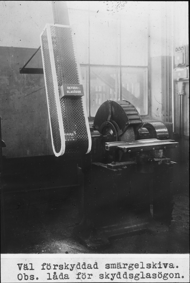 Skioptikonbild med motiv från yrkesinspektionens undersökningar på olika arbetsplatser. "Väl förskyddad smärgelskiva. Obs låda för skyddsglasögon".