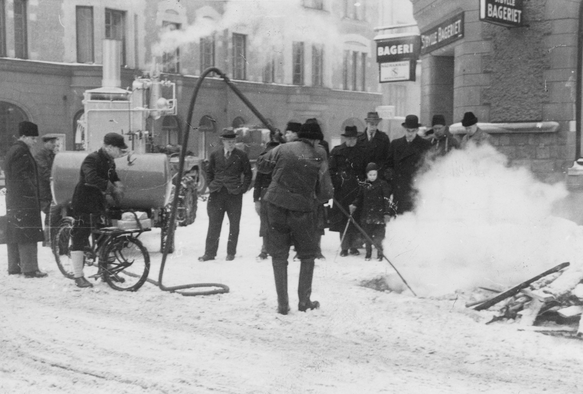 Upptiningsmaskin för frusna rännstensbrunnar. Maskinen i arbete på en av Stockholms gator.
