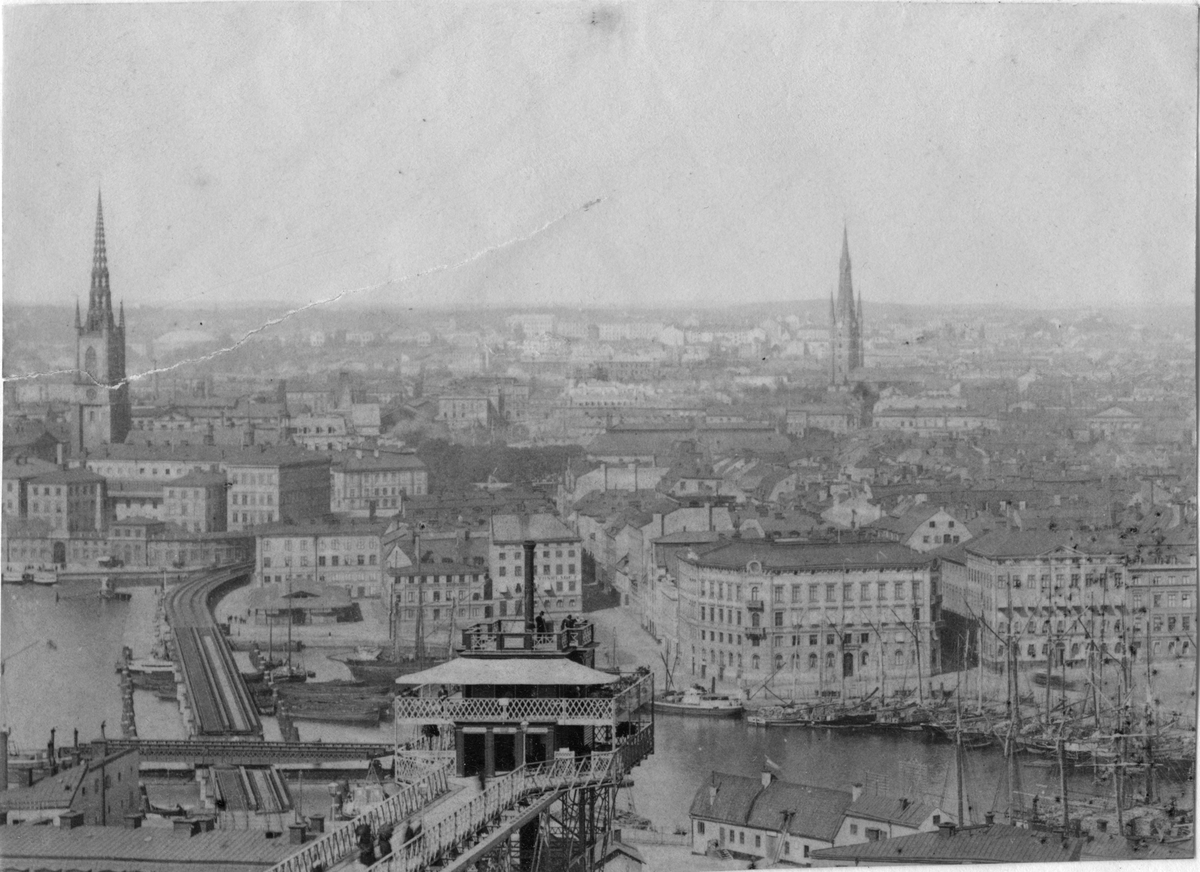 Vy över Stockholm och gamla Stan, sett från Mosbacke, Södermalm på 1870-talet. I förgrunden Katarinahissen.