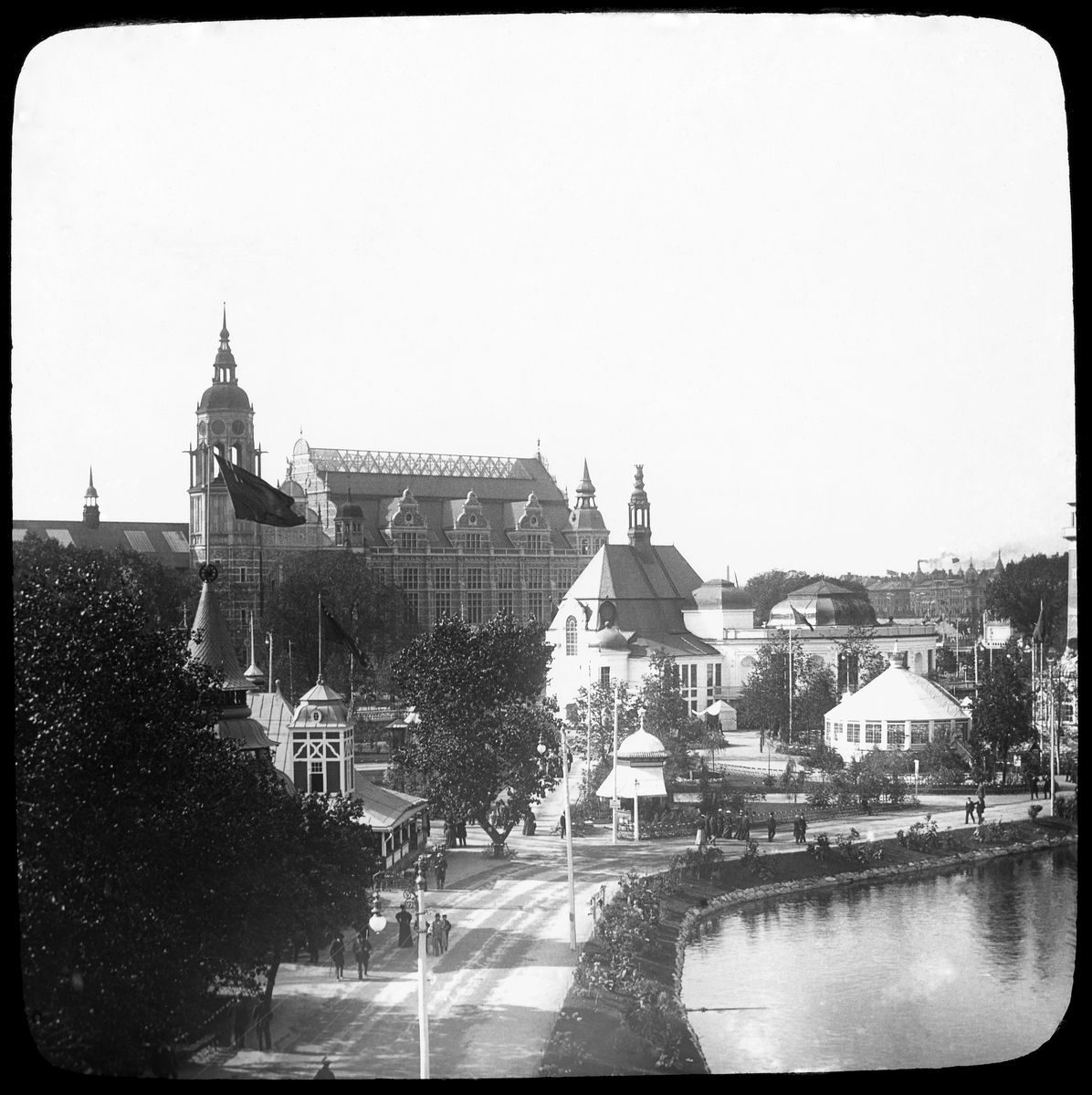 Skioptikonbild med motiv från Allmänna Konst- och Industriutställningen i Stockholm 1897. Vy mot Nordiska museet.