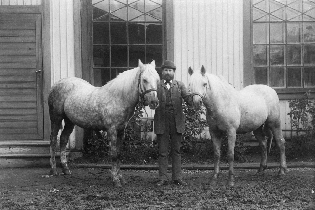 Träförädlings AB i Linköping. Kusken Jakobsson med bolagets hästar Gulle (till höger) och Bella. Framför gamla fabriksbyggnaden.