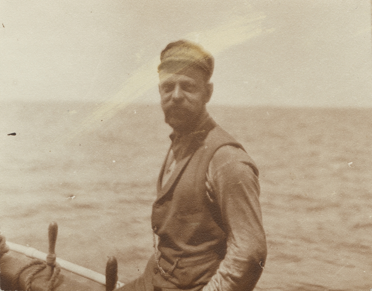 Fotografi från första svenska Antarktisexpeditionen 1901-1904. Motiv av man med keps ombord på båt.
