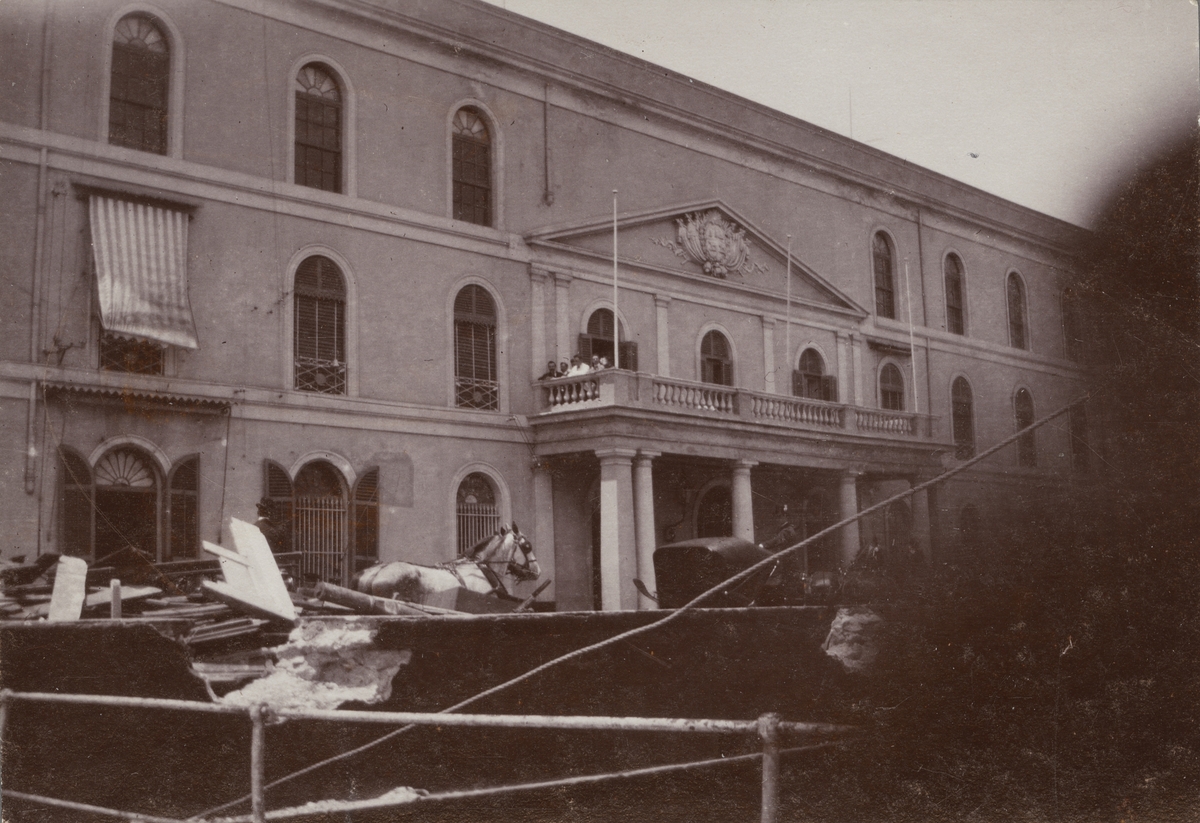 Fotografi från första svenska Antarktisexpeditionen 1901-1904. Motiv av stort hus med hästar och droskor utanför.