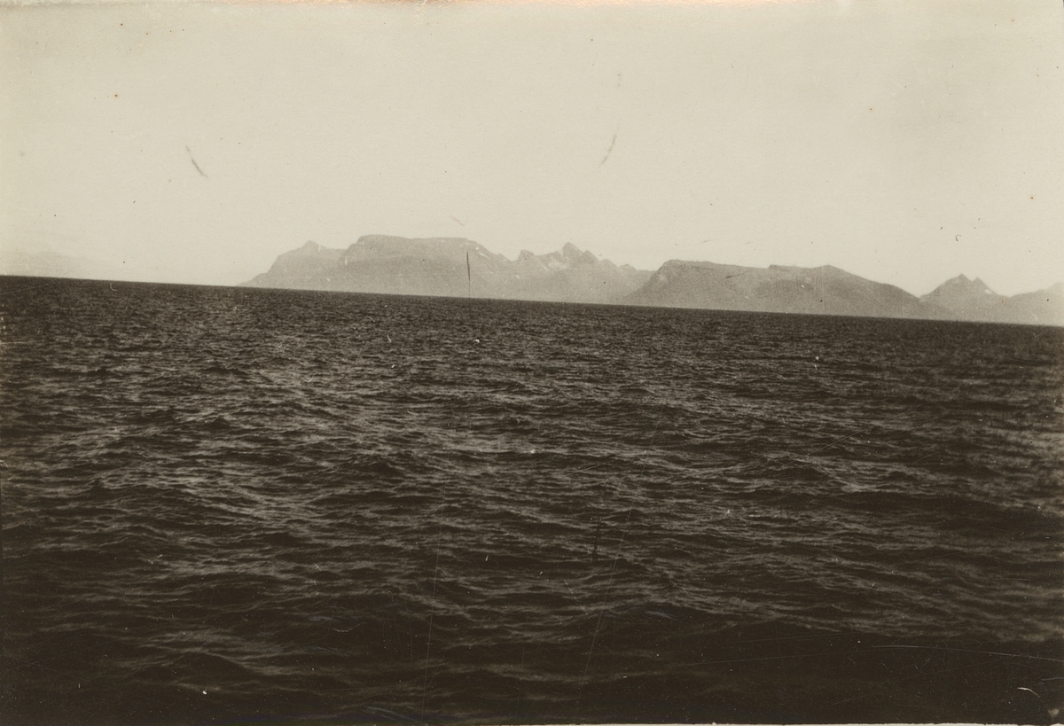 Fotografi från expedition till Spetsbergen. Vy över vidsträckt hav med berg i bakgrunden.