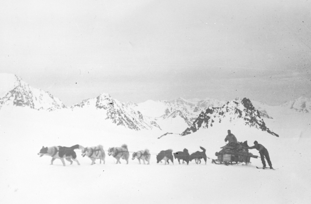 Fotografi från expedition till Spetsbergen. Motiv av två män och hundspann i ett snötäckt bergslandskap.