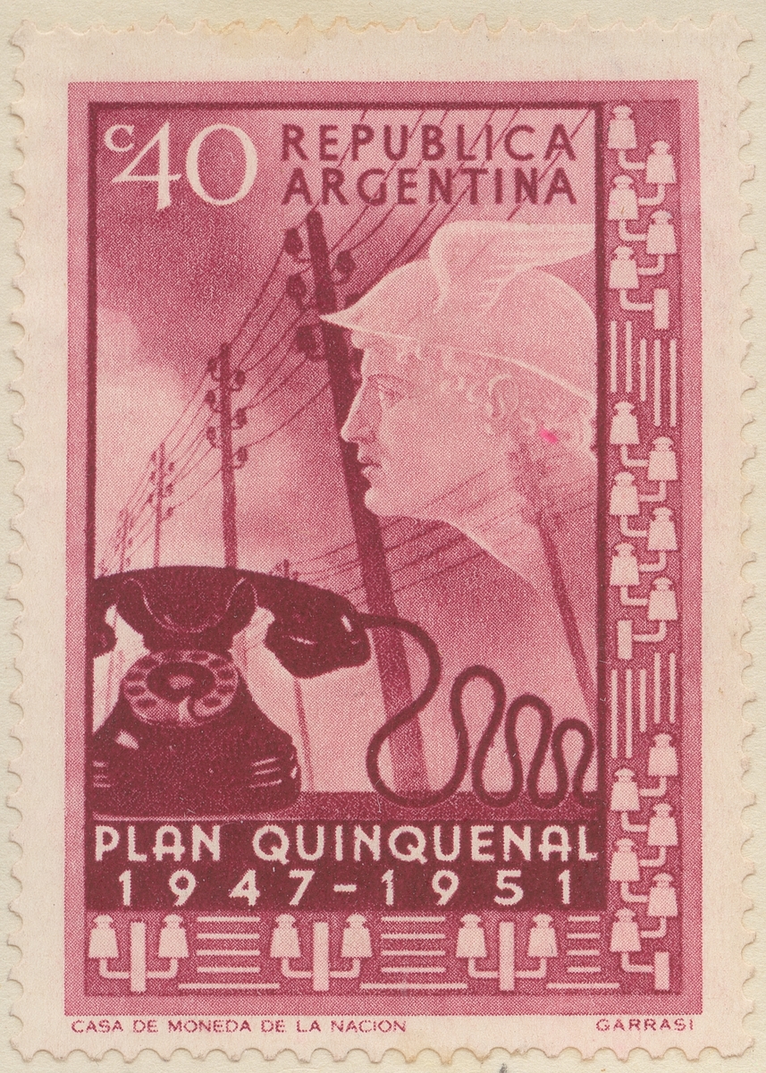 Frimärke ur Gösta Bodmans filatelistiska motivsamling, påbörjad 1950. Frimärke från Argentina, 1951. Motiv av Telefon och kommunikationssymboler. Merkurius. "Minne om 5-års planens slut: 1947-1951."