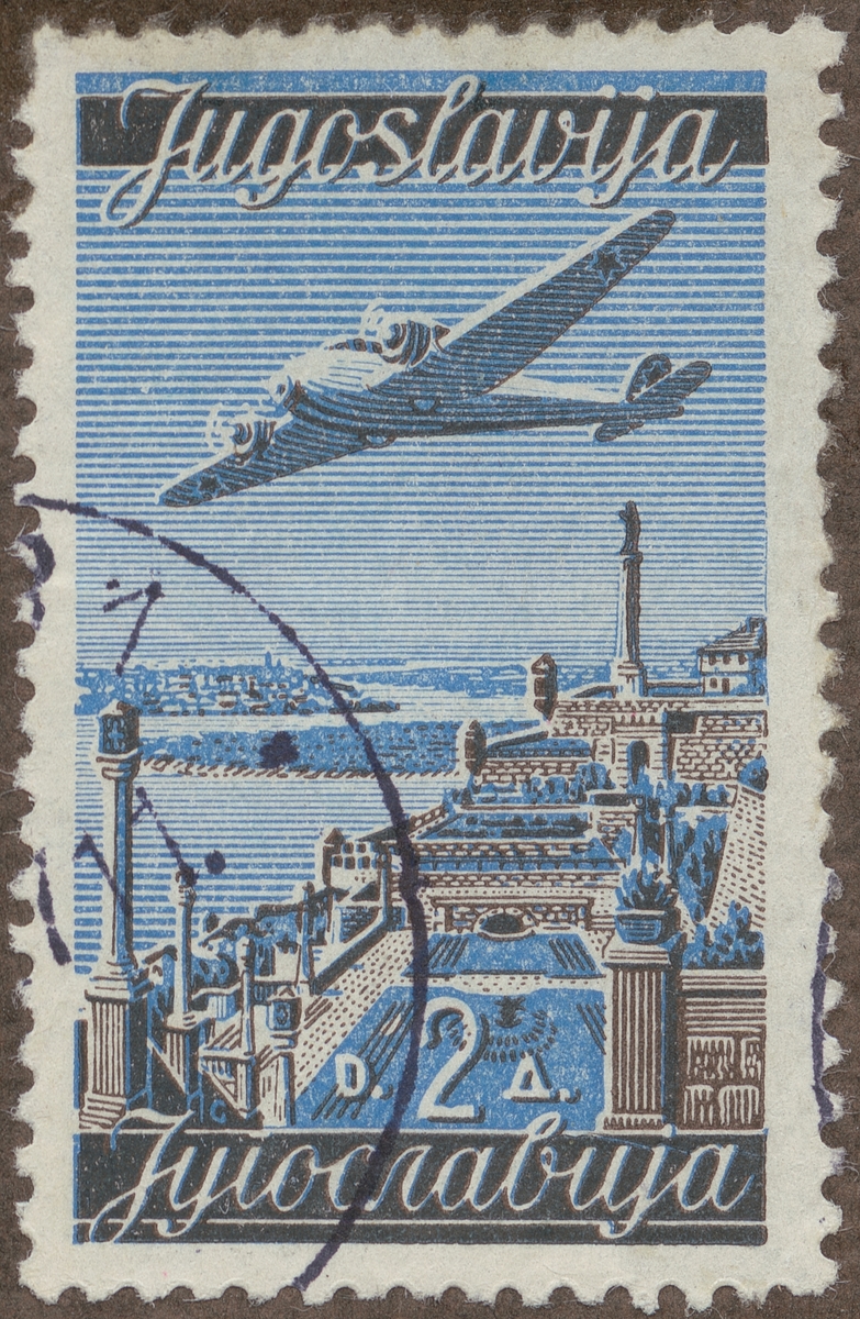 Frimärke från Jugoslavien, 1947. Motiv av Tvåmotorigt monoplan över Terrassen Kalimegdan, Belgrad.
