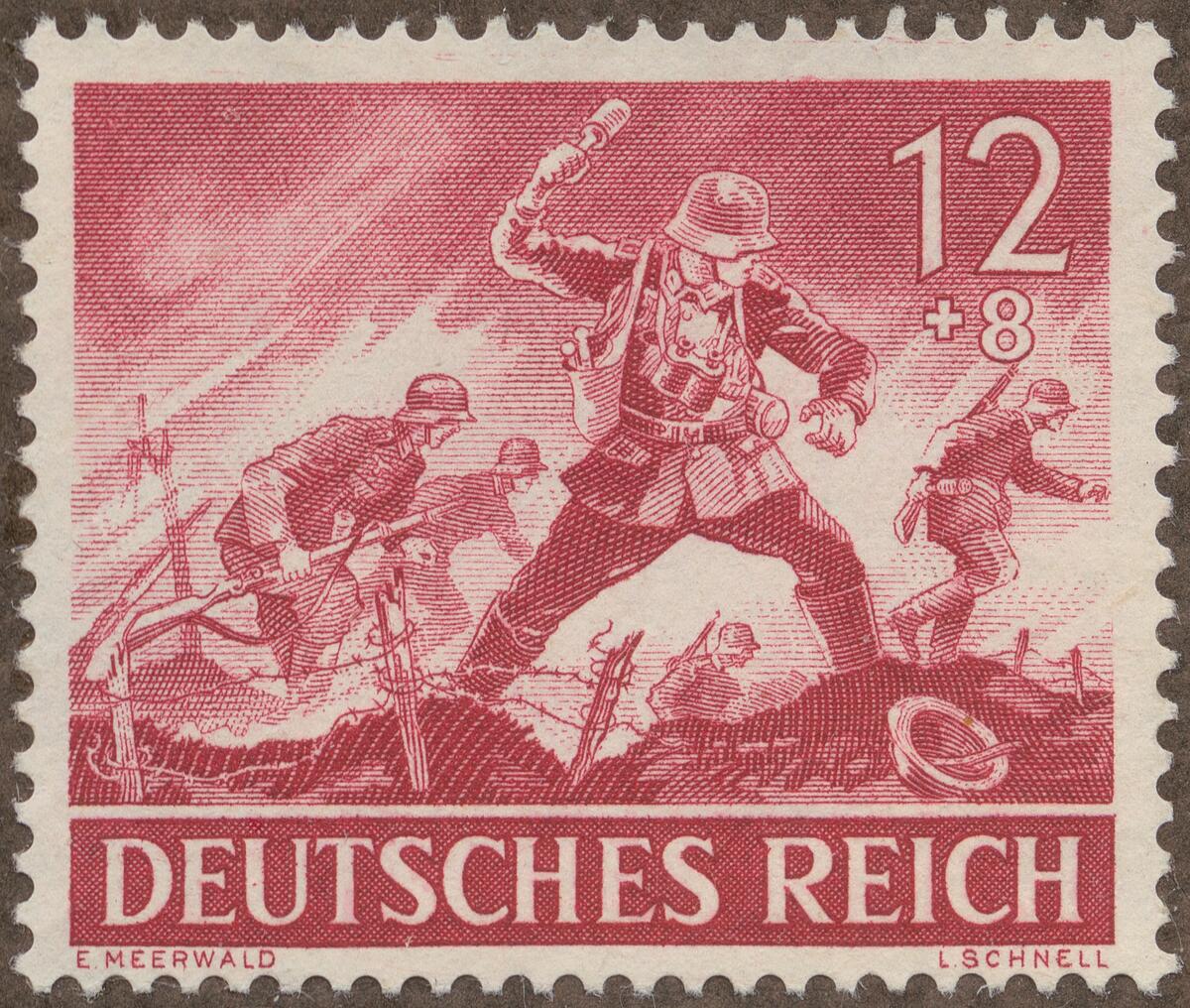 Frimärke från Tyskland, 1943. Motiv av Vapen: handgranat Tysk infanteristrid - tysk "Krigshjälte-serie 1943"