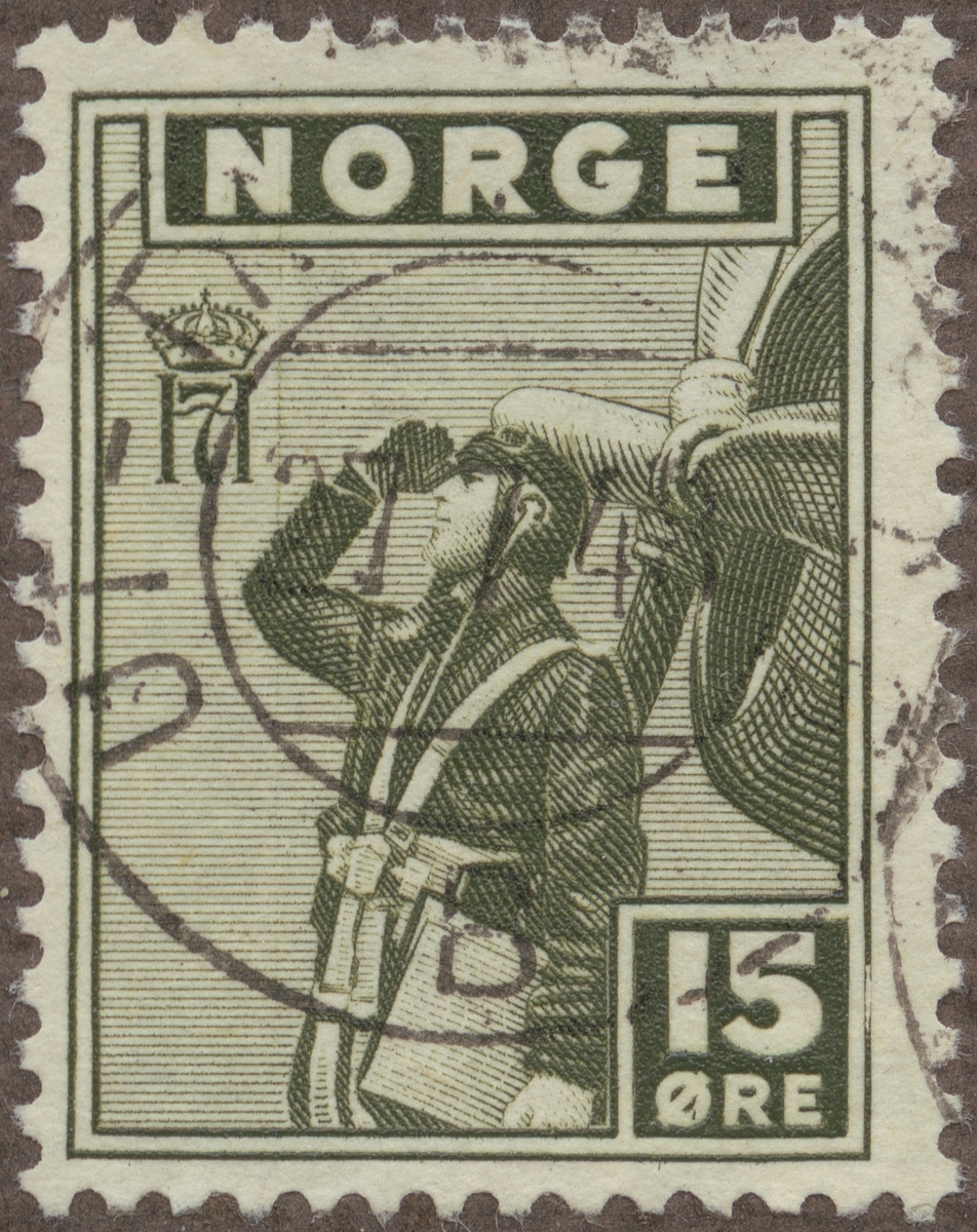 Titel: Frimärke ur Gösta Bodmans filatelistiska motivsamling, påbörjad 1950. Frimärke från Norge, 1944. Motiv av Norsk fältflygare framför sitt plan