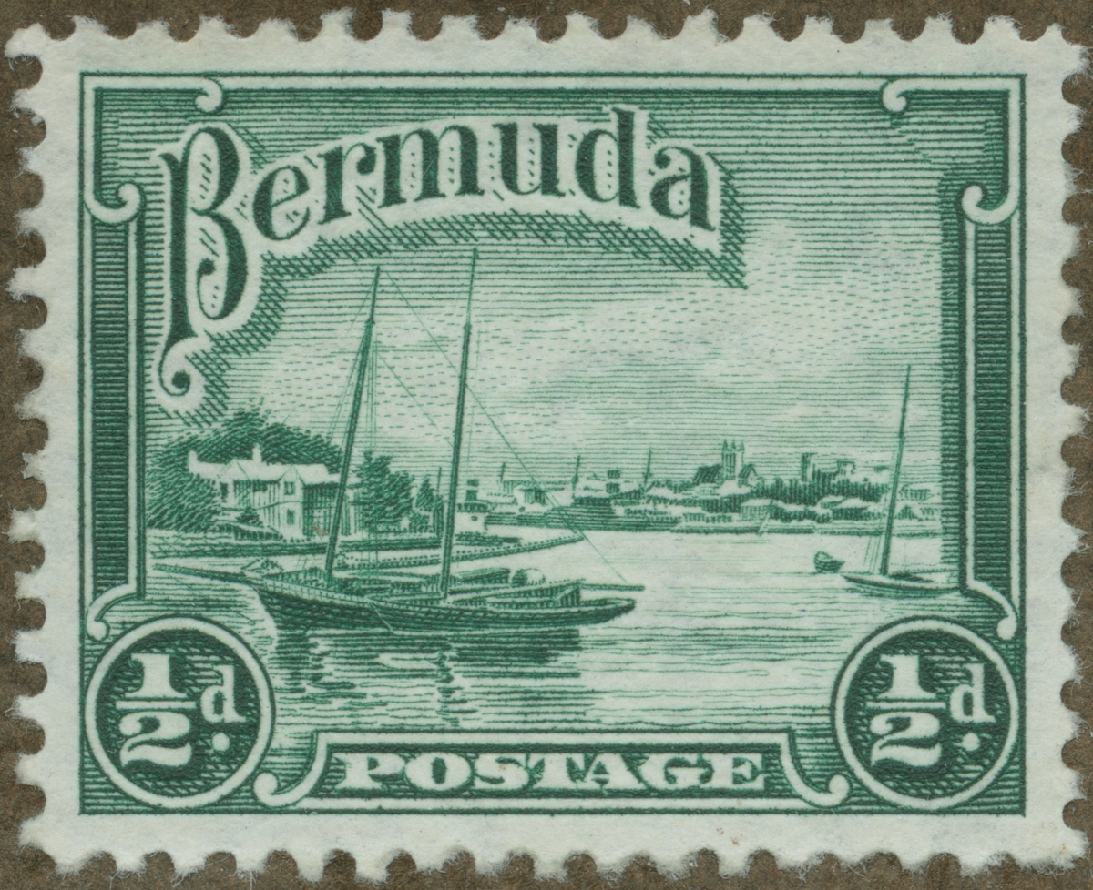 Frimärke från Bermudas, 1936. Motiv av Hamnen Hamilton Litet Fiskefartyg