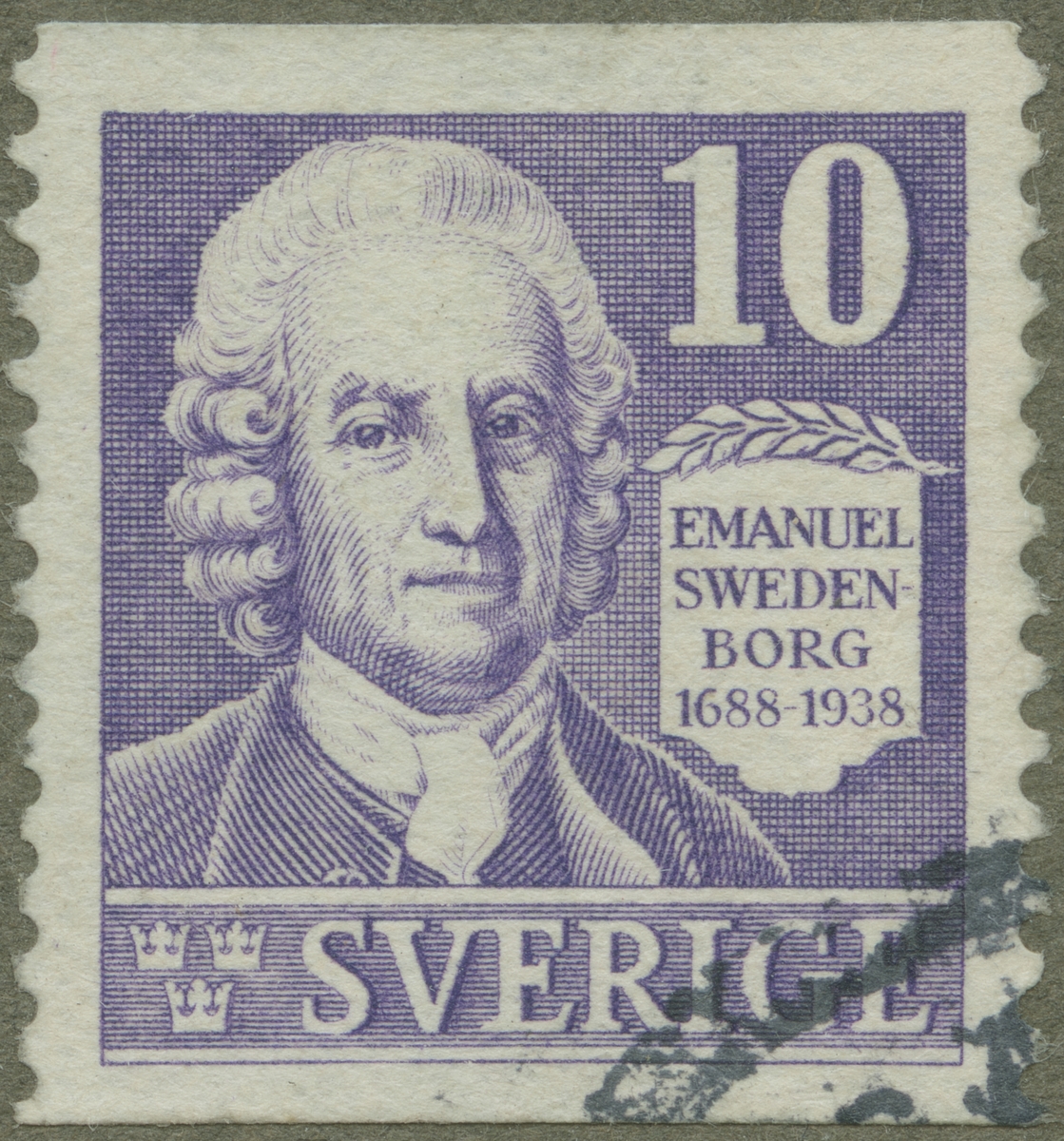 Frimärke från Sverige, 1938. Motiv av Emanuel Swedenborg 1688-1772. Svensk naturforskare. Författat böcker om järn och koppar. Redaktör för vår första tekniska tidskrift "Daedalus Hyperboraeus" 1716-1718. Förordade decimalsystemet för mynt. Gjorde utkast till flygmaskin med fasta bärplan. 250-årsminne av hans födelse. 1688-1938.