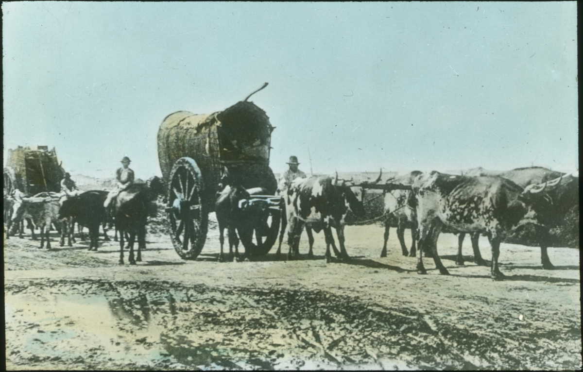 Kolorerad skioptikonbild med motiv av karavan med kor, hästar och vagnar.