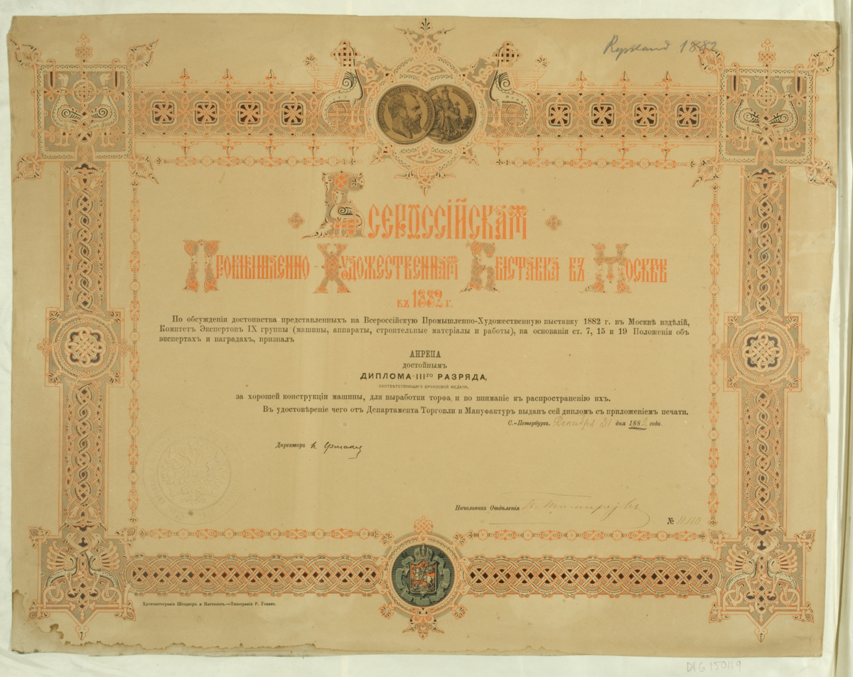 Ryskt diplom 1882 , ur boken med ritningar mm 1868-1887, av den svenske torvmaskinkonstruktören Aleph Anrep.