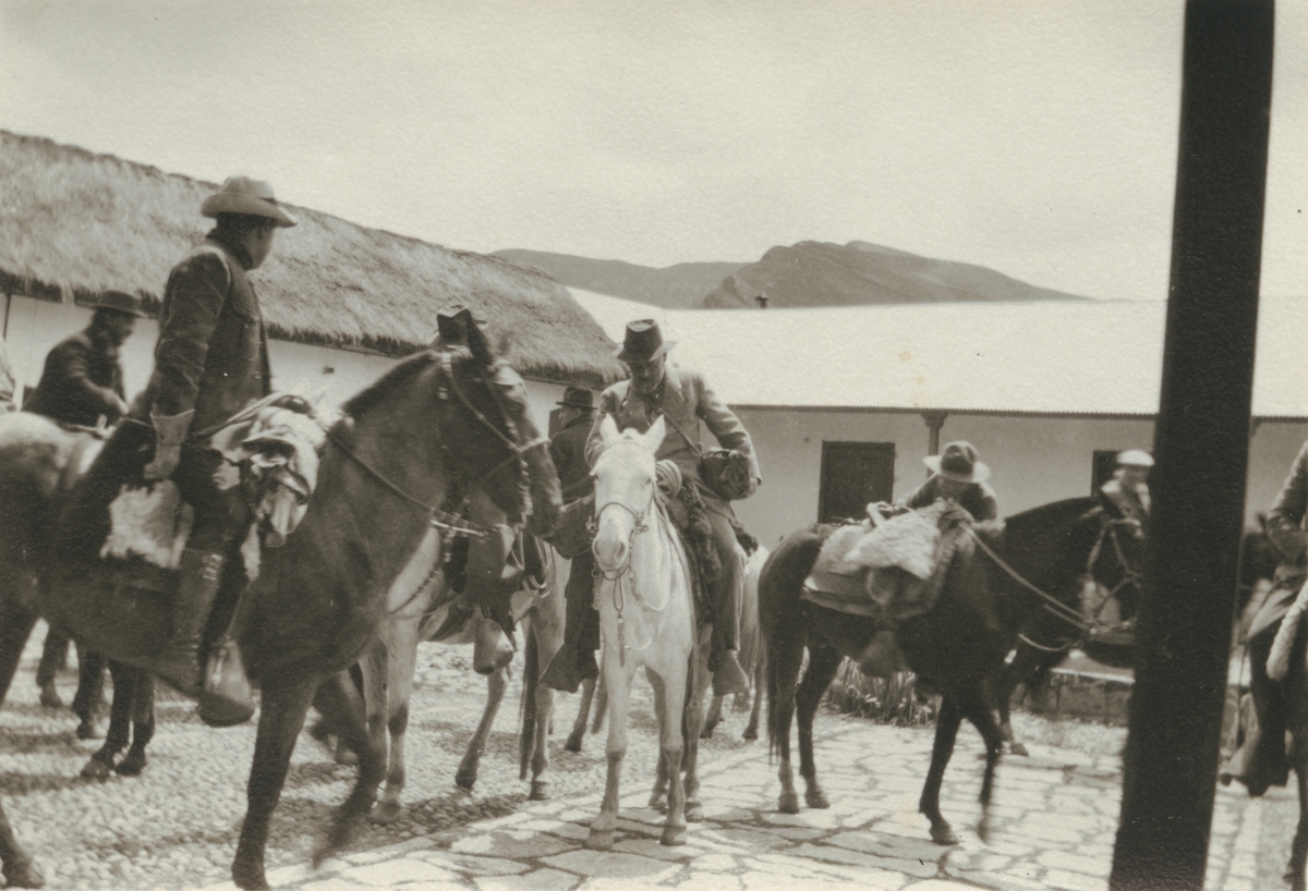 Fotografi från kuvert märkt med "Ernst Nordenskjöld". Motiv av expeditionsdeltagare till häst. Mannen i mitten av bilden med skägg och hatt kan vara Otto Nordenskjöld.