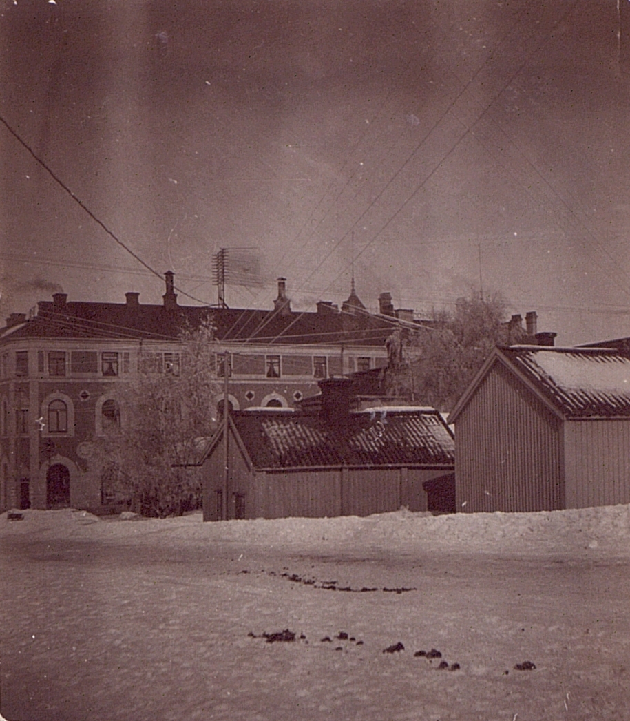 Titel: Härnösand telefonnät och stationer omkr. 1900 (Telefongalge på taket av byggnad).