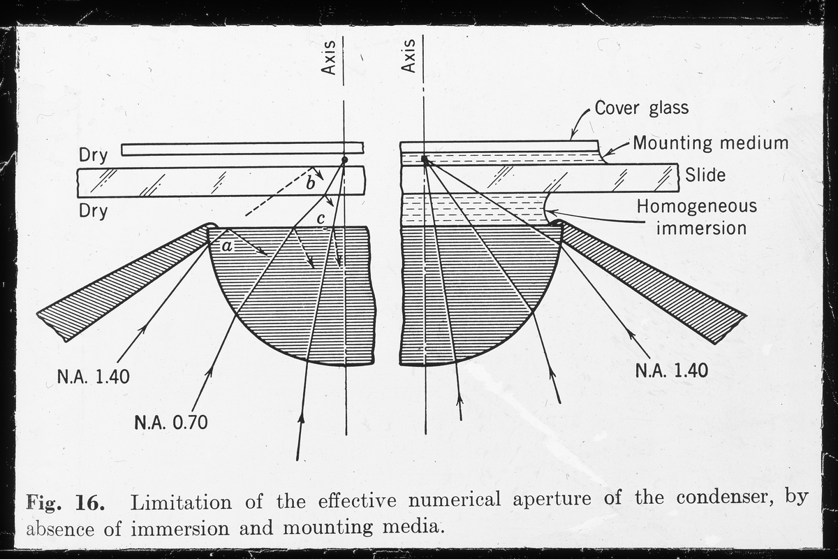 Begränsning av det effektiva numeriska aperturen hos kondensorn, genom frånvaron av nedsänkning ett monteringsmedel.