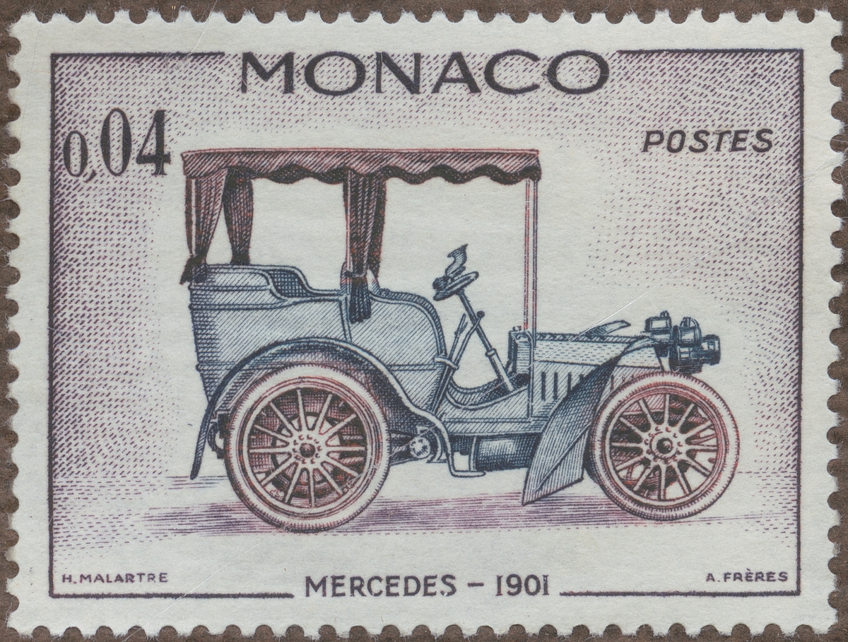Frimärken ur Gösta Bodmans filatelistiska motivsamling, påbörjad 1950. Frimärke från Monaco, 1961. Motiv av Mercedes: 1901