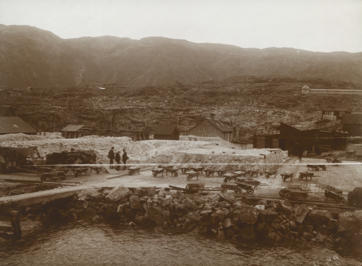 Fotografi från expedition till Grönland. Vy över stenbrott och ett antal trähus. I förgrunden står ett antal skottkärror.