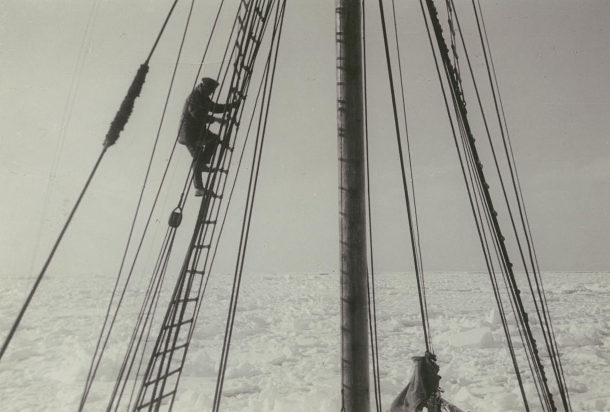 Fotografi från svenska undsättningsexpeditionen 1928. Motiv av fartyg med man som klättrar nerför stege. Fartyget är omgivet av ett islandskap.