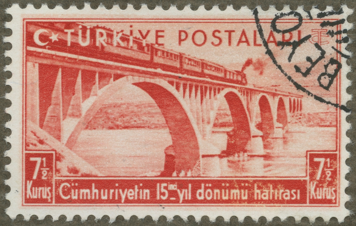 Frimärke från Turkiet, 1938. Motiv av Järnvägsbro i Turkiet "Serie till Republikens 15-årsminne"