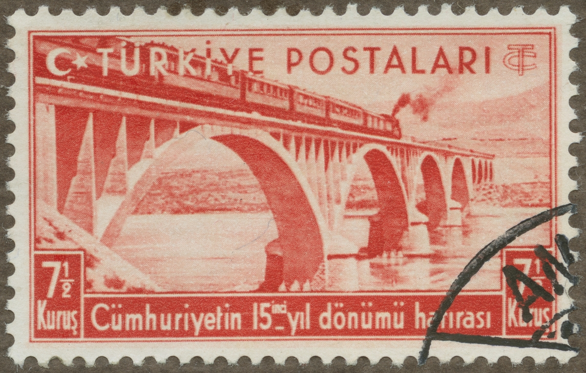 Frimärke från Turkiet, 1938. Motiv av Stor modern järnvägsbro i Turkiet 15-årsminne av Republikens införande