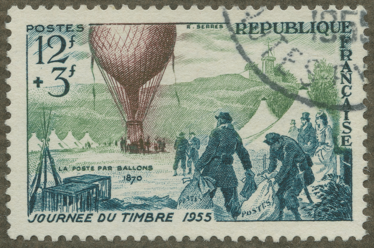 Frimärke från Frankrike, 1955. Motiv av Fri ballong för posttransport 1870 från det inneslutna Paris -Frimärkets Dag 1955-