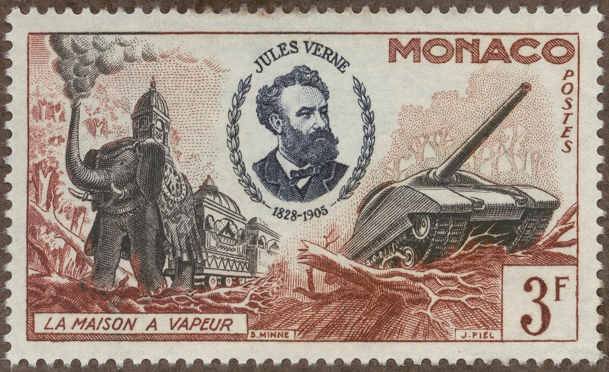 Frimärke från Monaco, 1956. Motiv av "La maison á vapeur" av Jules Verne (1828-1905) Tank-kanon
