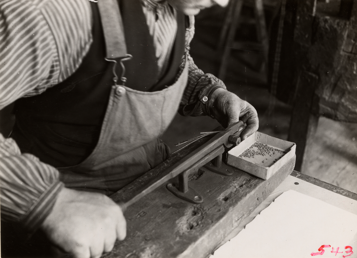 Knappnålstillverkning vid J.H. Tidbeck Metallduksväveri och Metalltrådsvarufabrik. Tränsarna klipps med knappsax.