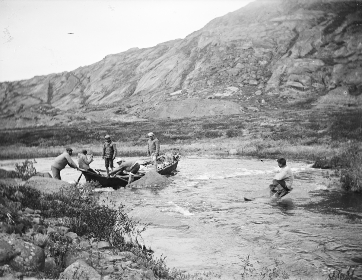 Fotografi från Grönland. Motiv av män i båt nedanför berg.