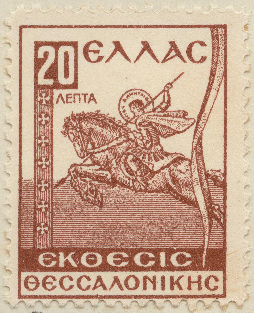 Frimärke från Grekland, 1934. Motiv av Lansbärande ryttare S.t Demetrius. -Propaganda för Saloniki Mässan-