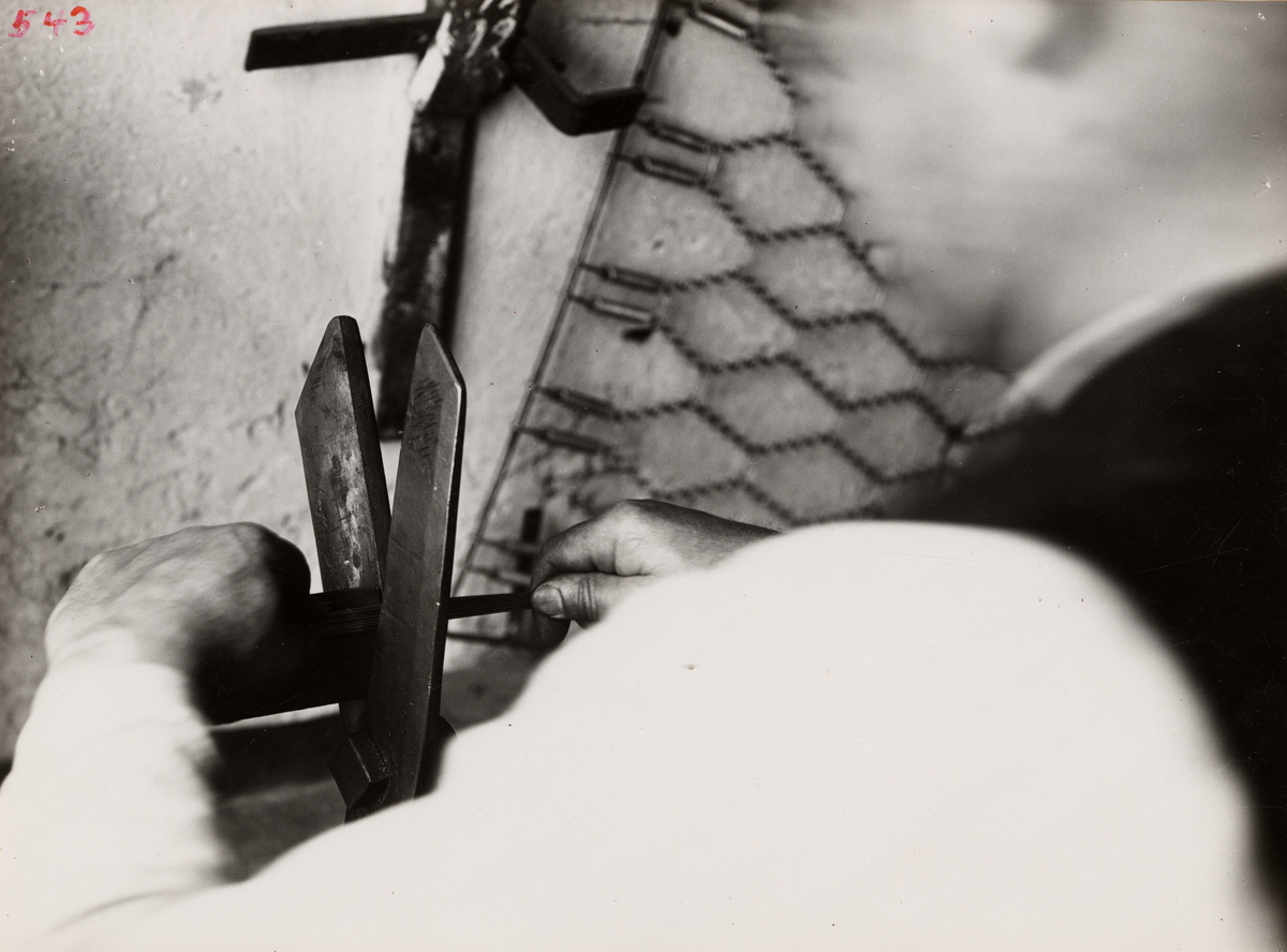 Knappnålstillverkning vid J.H. Tidbeck Metallduksväveri och Metalltrådsvarufabrik. Avskärning av tråd i bestämda längder med knäsax.
