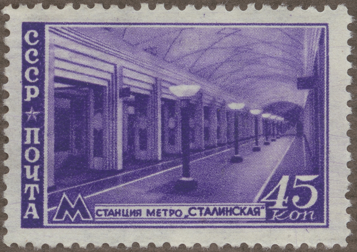 Frimärken ur Gösta Bodmans filatelistiska motivsamling, påbörjad 1950. Frimärke från Ryssland, 1947. Motiv av Moskwa-Metron Stalin-stationen